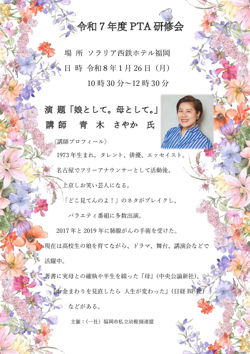 令和7年度PTA研修会開催のお知らせ 日 時:令和8年1月26日(月)午前10時30分~12時30分 会 場:ソラリア西鉄ホテル福岡 8階 彩雲(雪・月) 講 師:青木さやか氏(タレント・俳優・エッセイスト) 演 題:「娘として。母として。」 参加対象:(一社)福岡市私立幼稚園連盟 加盟園 保護者 参加方法:園より12月19日までに連盟へ参加申し込み